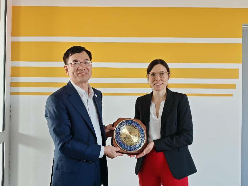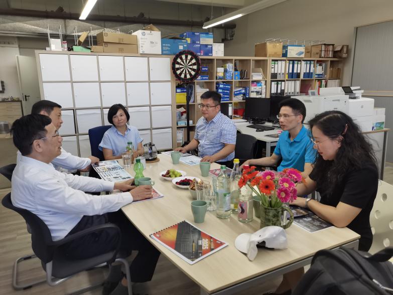 代表团一行拜访了校友企业Maxi Handels GmbH,何传添与企业代表深入交流了企业在德国创业和运营情况,并就如何发挥企业平台作用,为我校学生赴德交流创造实习实践机会充分沟通了意见。