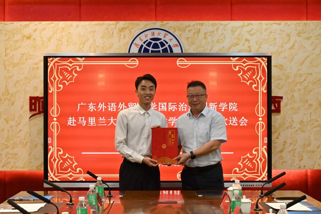 本网讯 7月1日,学校举办2023级、2024级学子赴马里兰大学、欧洲大学学院学习欢送会。我校党委常委、副校长谢伟光在会上致辞,并为“国际组织与国际治理专业人才卓越远航奖”的获得者以及赴美、赴欧学习的同学们颁发荣誉证书。国际治理创新学院院长赵龙跃主持会议。