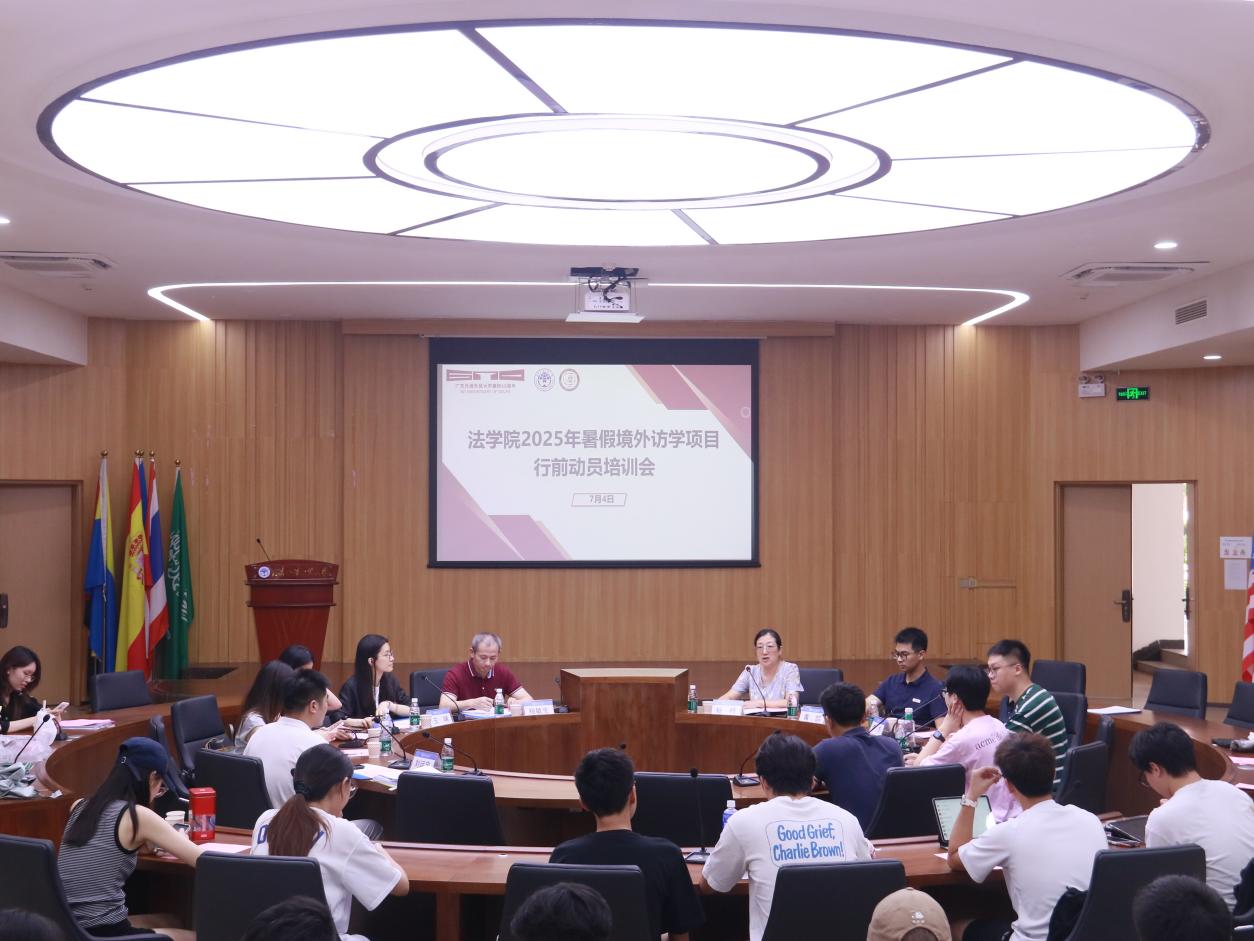 本网讯 7月4日下午,我校法学院2025年暑假境外访学项目行前动员培训会在大学城校区教学楼D102国际组织会议室举行。法学院党委书记杨敏生、法学院副院长黄喆、访学项目带队教师以及往届优秀学生代表、访学成员等100余人参加会议,会议由法学院副院长杨桦主持。