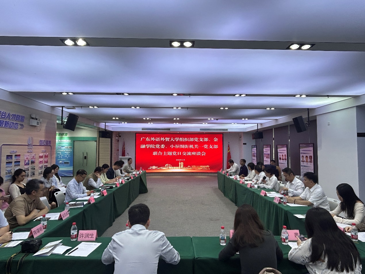 本网讯 为深入学习贯彻党的二十届四中全会精神,切实把思想和行动统一到习近平总书记、党中央关于“十五五”发展的战略部署上来。11月7日下午,我校组织部、金融学院与小谷围街在广州大学城联合开展主题党日并进行学习交流。学校党委常委、组织部部长黄秀娟,金融学院党委书记徐昶斌,大学城管委会副主任、小谷围街党工委副书记、街道办事处主任任树兵,小谷围街党工委委员陈丽媚等出席座谈交流。