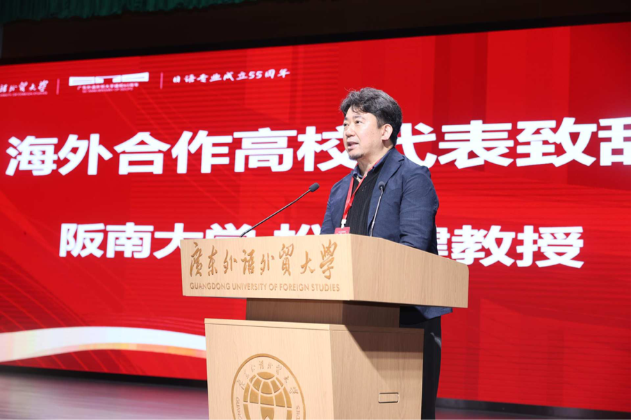 阪南大学校长平山弘教授作为海外合作院校代表致辞(研究生院院长松田健教授代读)。他在贺信中深情回顾了两校二十年来在国际化人才培养、学术研究合作等方面的丰硕成果与动人故事,并对广外日语专业取得的成就表示高度赞赏。他表示,期待与广外继续拓展合作领域,深化交流内涵,共同推动东亚地区高等教育合作迈向更高水平。