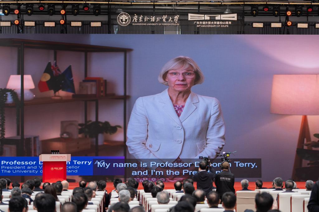 国外高校代表、澳大利亚昆士兰大学校长黛博拉·特里通过视频向广外60周年校庆致以热烈祝贺。她表示,两校通过 20 多年的携手努力,已让成千上万的学生体验跨文化学习,并在国际科研合作、应对全球性挑战方面取得系列成果。广外是一座深入了解和接触中国的学术与文化的重要桥梁,坚信广外必将继续发展壮大,不断扩大影响力,也期待双方在未来能够继续深化合作、共创更美好的未来。