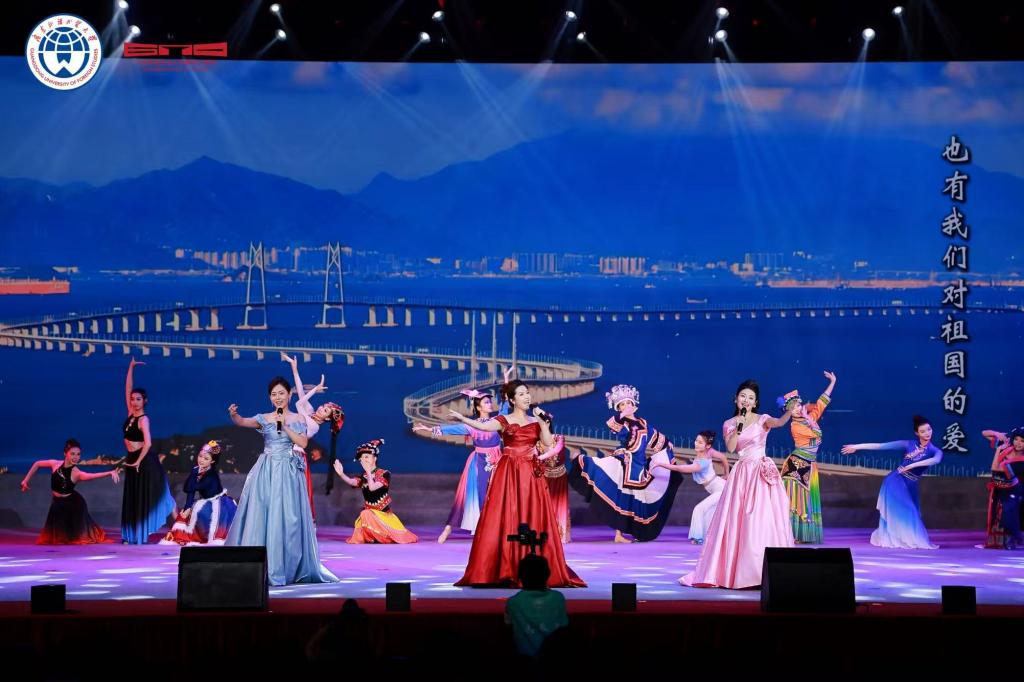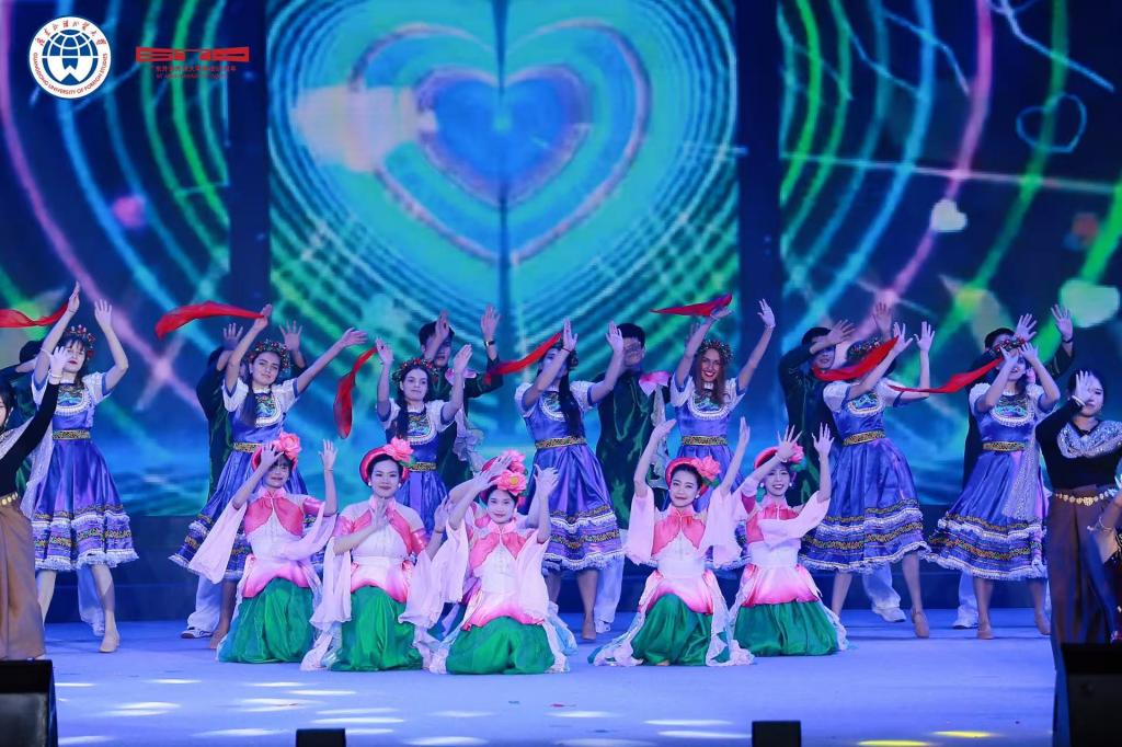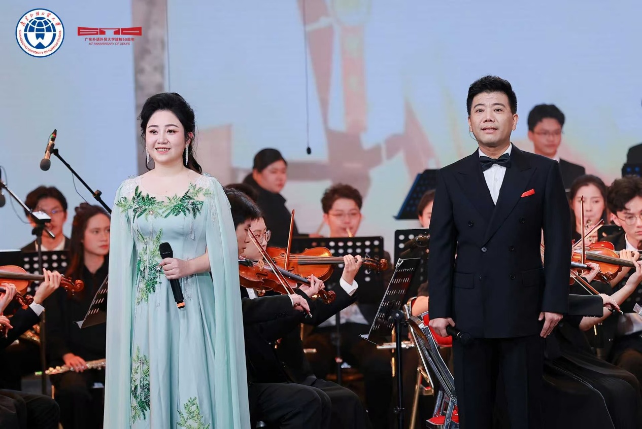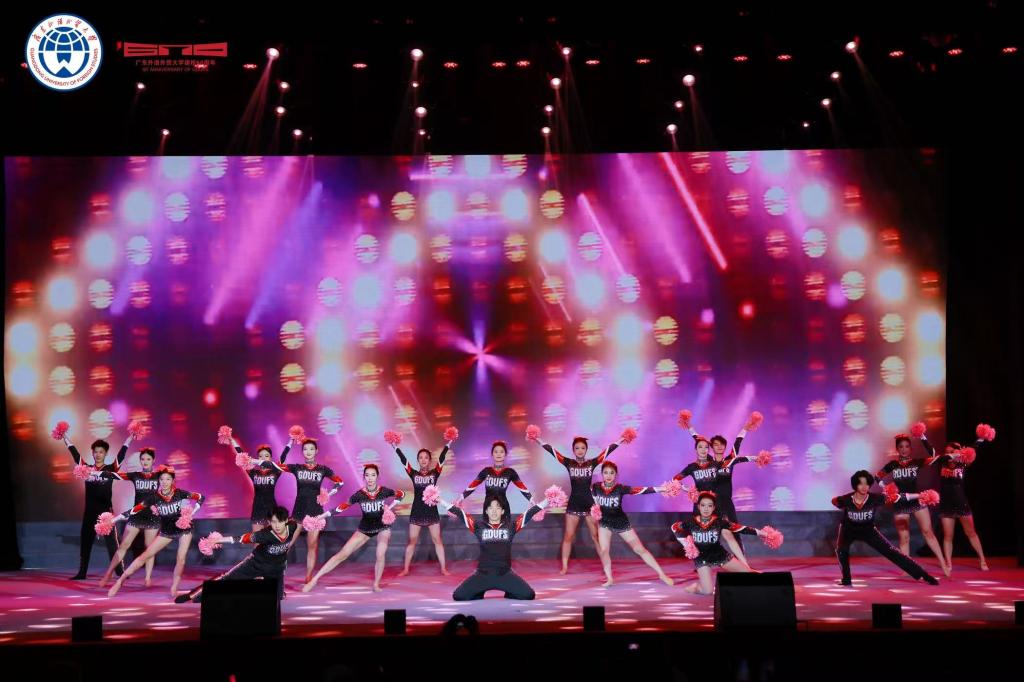 《凤鸣岭南》管乐合奏以恢弘交响奏响序章,既复刻了广外建校之初在岭南大地播撒教育火种的热忱,也将新时代学子的蓬勃朝气熔铸于旋律之中。每一次拨动琴弦,每一次叩响琴键,无不表达学子对学校的真挚祝福和深沉热爱。紧随其后的《甲子荣光》由羡涛老师、王馨若老师搭档对唱,管弦乐伴奏,以深情嗓音串联起广外六十年的时光刻度:从初创时期的筚路蓝缕,到如今国际化办学的蓬勃气象,将对母校的眷恋揉进了歌声里。《青春飞扬》表演唱则以广外青年更具活力的形式登场,生动的演绎让青春的底色愈发鲜明,裙摆飞扬,摇曳如花,生动展现广外学子的风华正茂与蓬勃朝气。台下观众的欢呼与掌声,成了此刻最热烈的应和。《环球舞韵》舞蹈更是将会场推向高潮,中外舞者们以跃动的身姿勾勒出广外“学贯中西”的校训,也让现场嘉宾直观感受到这所“岭南国际化人才摇篮”的独特魅力。