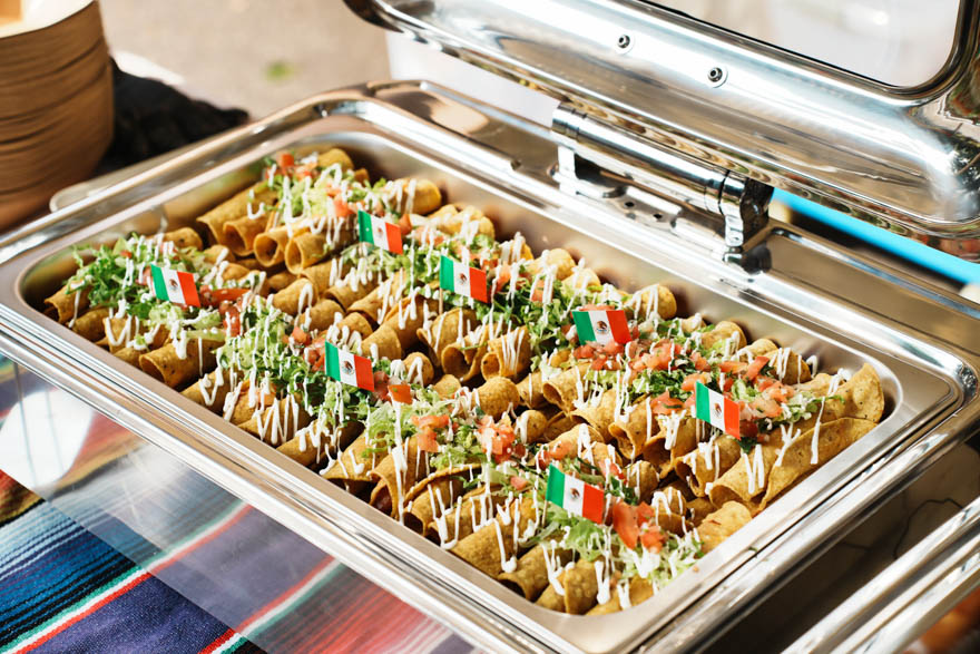 墨西哥摊位以玉米饼为底,铺满烤香肠与玉米粒,搭配酥脆可口的鸡肉炸卷和造型别致的迷你帽形小吃,辣椒香与麦香在齿间交织,风味浓郁。