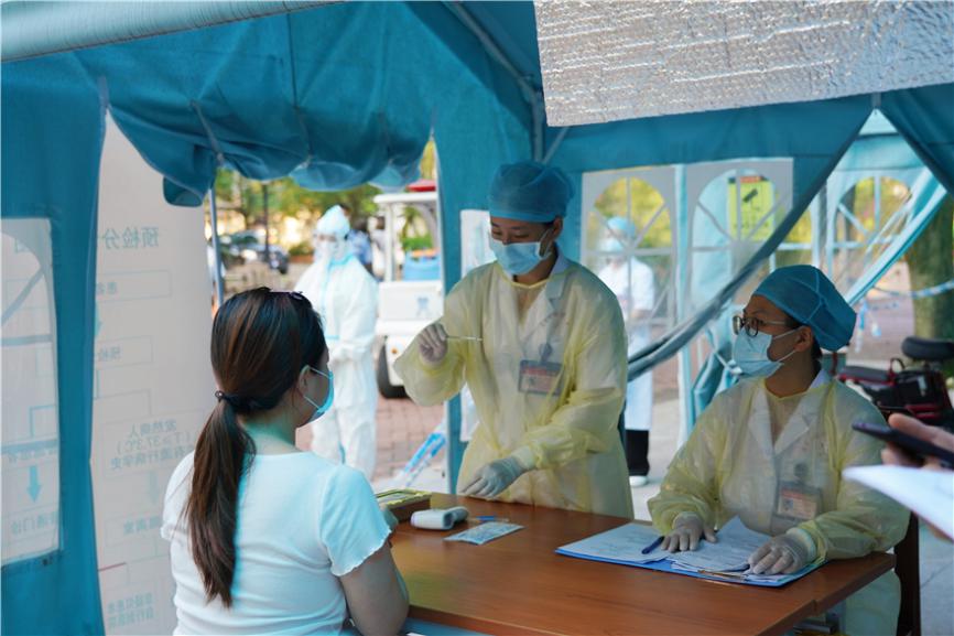 在应急预检分诊演练中,场景呈现了一位学生发现体温异常,工作人员立即联系所在学院辅导员、校门诊部启动应急预检分诊。值班医护人员对该学生进行详细的流行病学史问询并登记资料,引导该生到临时观察点等候,同时联系指定发热门诊医院转运。学生离开后,门诊部工作人员对密切接触者隔离观察,对病例活动场所进行消毒。