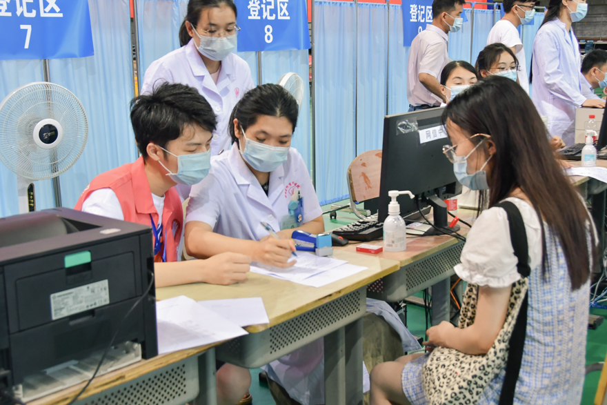 由于天气炎热,体育馆已早早开启了空调设备。记者了解到,疫苗接种现场分为等候区、咨询登记区、接种区、留观区、应急处置区,各区域均设有医务人员以及志愿者进行相关指引,秩序井然。疫苗接种人员经测温和登记后有序接种,在留观区观察三十分钟无异常反应后方可离开。