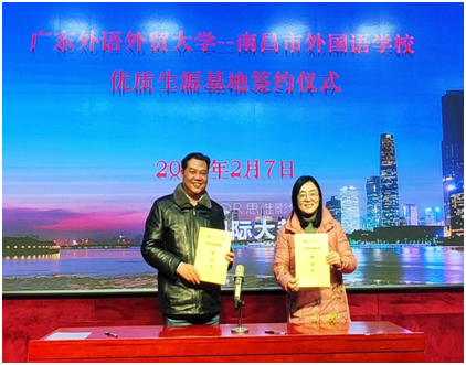 2月7日下午,我校与南昌市外国语学校共建优质生源基地签约和授牌仪式在南昌市外国语学校举行。南昌市外国语学校校长万瑛、校党委书记万群荣、副校长侯婷、桃苑校区执行校长罗扬等,我校教务部部长陈金诗、副部长邓丽君、招生办科长周汉新出席了签约和授牌仪式。南昌市外国语学校鸿雁班学员、高中班主任、外语教研组教师、部分高三学生与家长等共计100余人参加了本次活动。