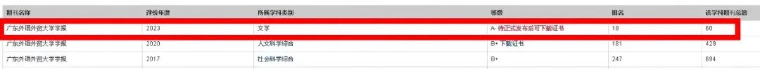 2024年4月,RCCSE《中国学术期刊评价研究报告》(第7版,以下简称《报告》)正式发布,《广东外语外贸大学学报》(以下简称《学报》)被评为“RCCSE中国核心学术期刊”,在所有60本文学专业期刊当中排名靠前,位居第18名,取得了1990年办刊历史以来新的突破。
